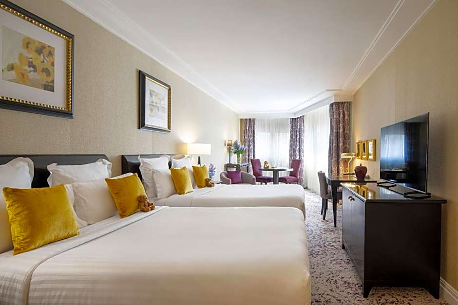 Family Room with two queen beds, free wifi in the room. Marble bathroom, working desk and table. Room with street view